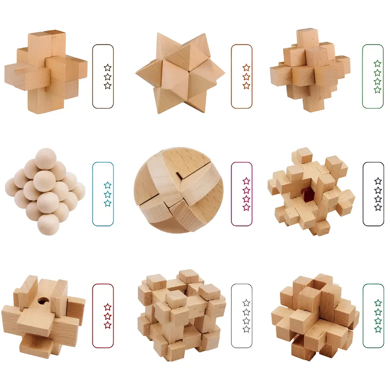 Het hout voelt prettig aan in je handen en de puzzels zijn moeilijk genoeg om je echt te laten focussen. Goed voor het geheugen en geduld!