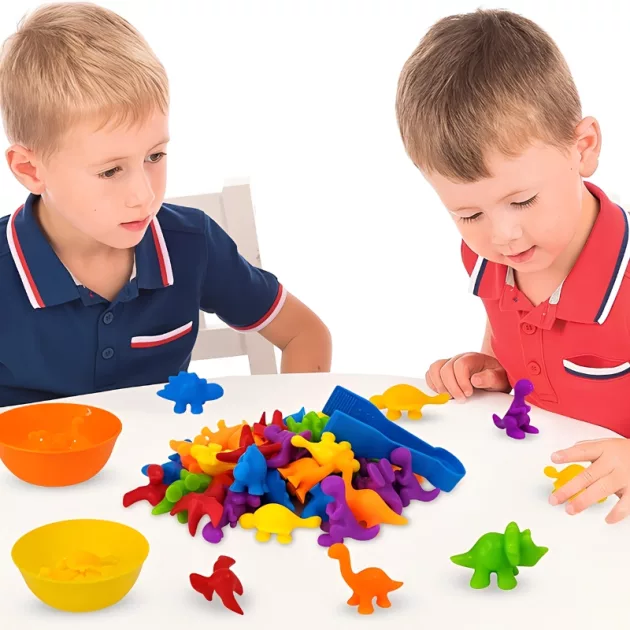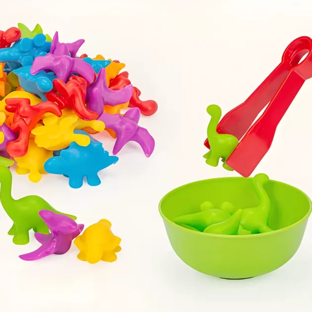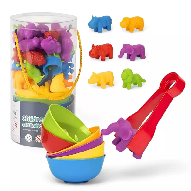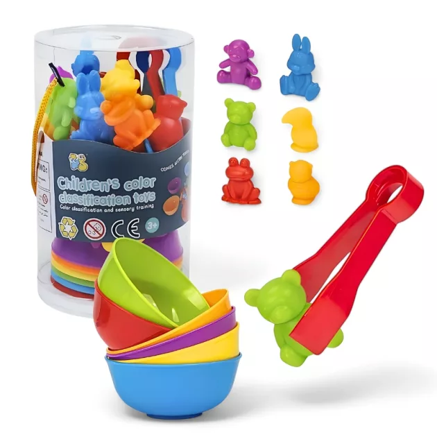 Motorische vaardigheden - Met behulp van de pincet pakken kinderen de figuren op en plaatsen ze in de bekers. Dit helpt bij het ontwikkelen van behendigheid en hand-oogcoördinatie, wat belangrijk is voor dagelijkse activiteiten.