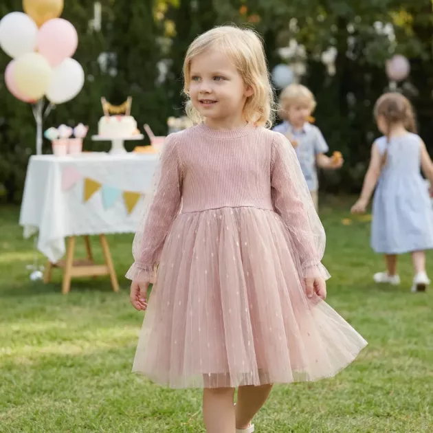 Kinderen stralen bij elke speciale gelegenheid in dit prachtige kledingstuk. Zachte mesh-lagen draaien sierlijk, perfect om vrolijk te zwieren de hele middag. De zachte stof houdt kleintjes de hele dag blij en comfortabel.
