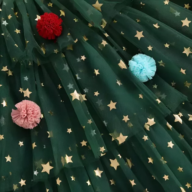 Het katoen voelt zacht en lief aan. Mijn peuter hield van de pluche versieringen. Ze was het stralende middelpunt op haar schoolfeest!