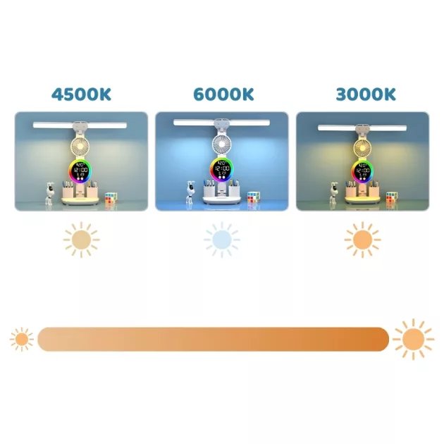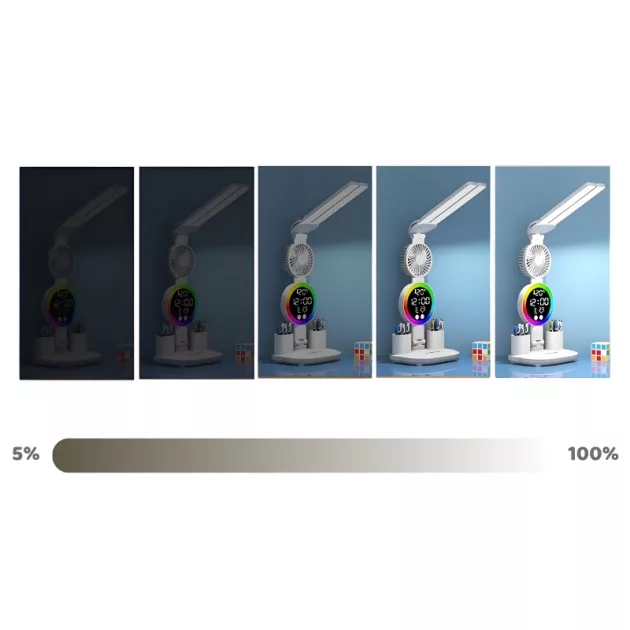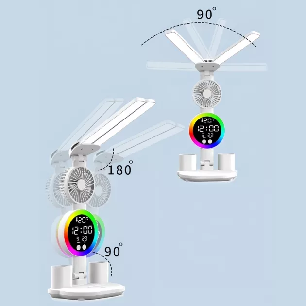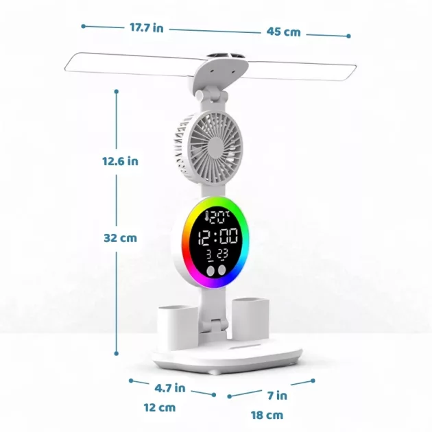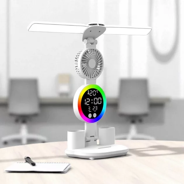 Ik gebruik de lamp en ventilator elke ochtend. De klok is goed zichtbaar en mijn bureau blijft nu georganiseerd.