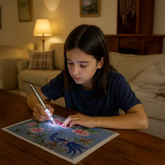 Geen donkere hoeken meer op mijn kunstwerken! Deze speciale pen laat elk glinsterend steentje opvallen. Nu kan ik geweldige cadeaus maken voor vrienden.