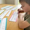 We bewaren de rekenset op de keukentafel. Na het eten kiezen de kinderen ieder een kaart, lossen de sommen op, vegen alles schoon en pronken met hun scores.