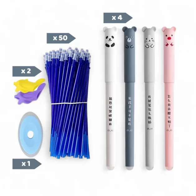 Ik vind het fijn dat er geen inkt achterblijft na het wissen. De navullingen houden me aan de gang, zelfs na veel huiswerk. Het uiltje is schattig.