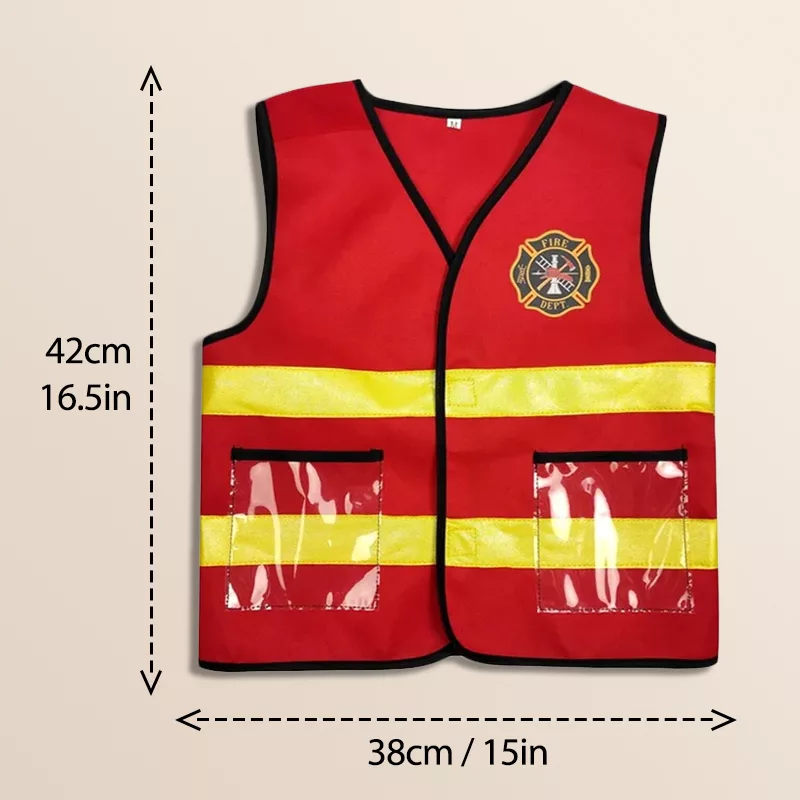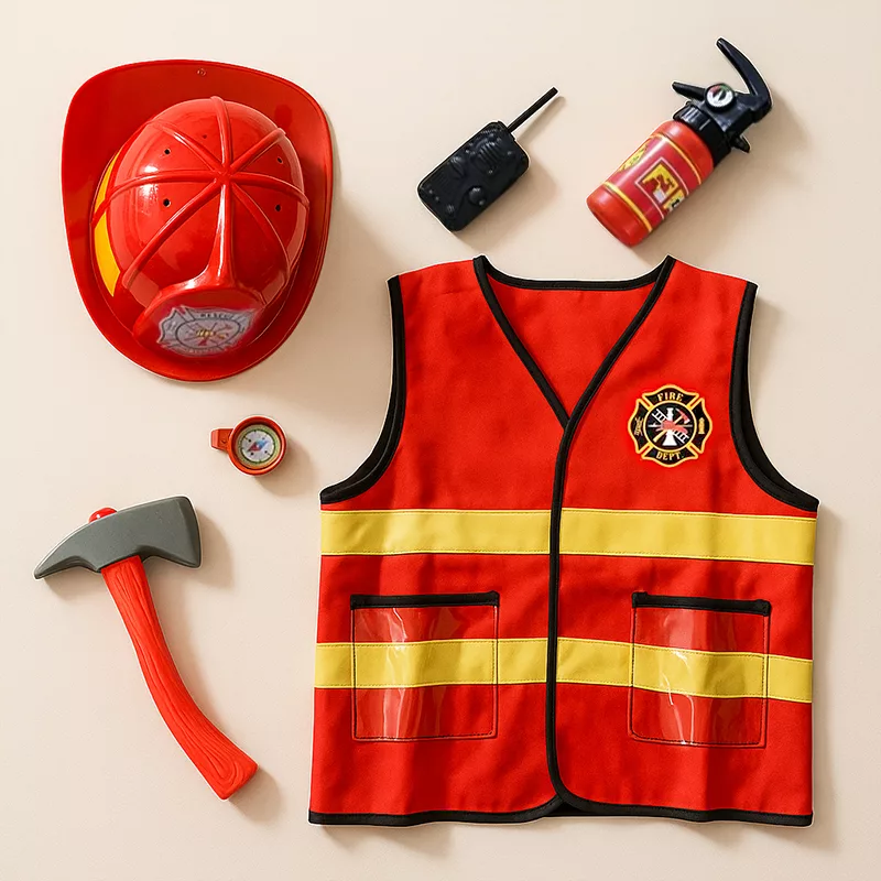 Het hesje en de helm lijken precies op het echte werk! Mijn kleine broertje vindt het geweldig om brandweer te spelen en onze knuffeldieren te redden.
