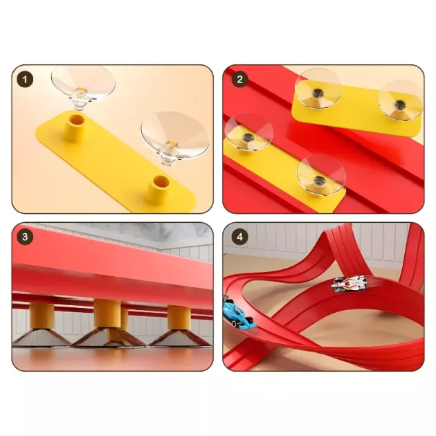 Ik vind het leuk dat ik bijna overal een racebaan kan bouwen. Mijn favoriet is zigzags maken op mijn slaapkamerdeur. De zuignappen werken ook op gladde muren.
