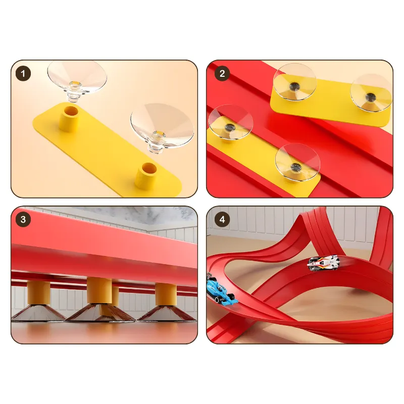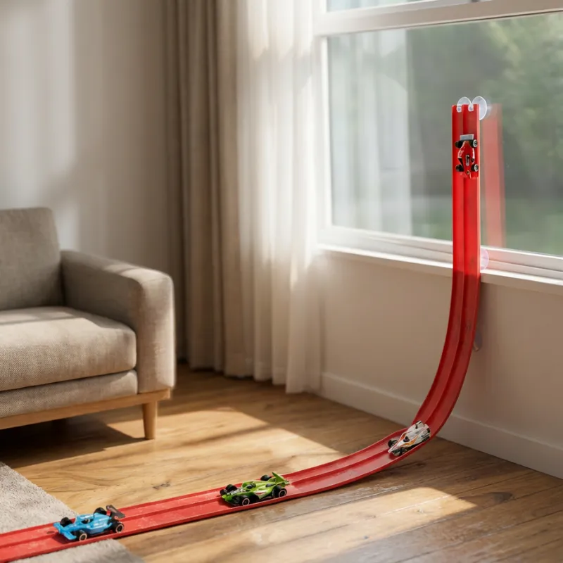 Mijn vrienden komen speciaal langs om met mijn racebaan te spelen. We doen wedstrijden wie de langste baan kan maken. De zuignappen glijden nooit!