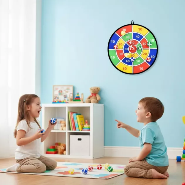 Mijn kinderen hebben veel plezier met de dartset. Ze spelen urenlang samen en er is nooit rommel, want de ballen blijven gewoon aan het bord plakken.