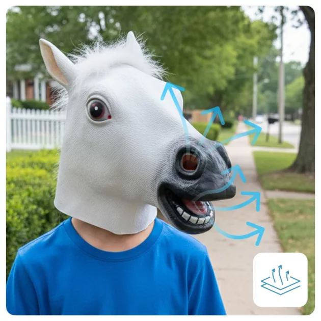 Paardenmasker past perfect op mijn neefje. Hij rent hinnikkend door het huis. Nooit klachten dat het strak of zweterig is. Elke keer weer lachen!