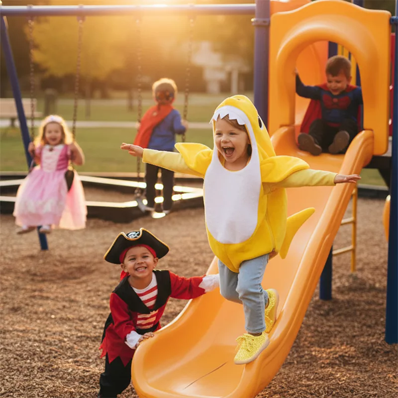 Mijn broertje vond het geweldig om een haai te zijn. De felle kleuren maakten hem ook makkelijk te vinden op het speelplein! Ademend materiaal was echt fijn.