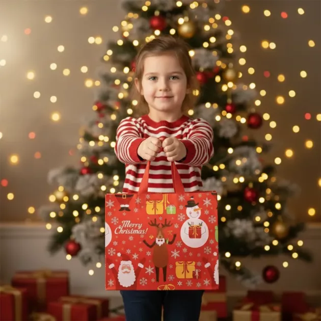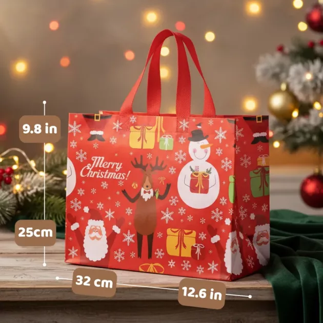 De feestelijke tas gebruikt voor al onze familiegiften dit jaar. De handvatten zijn echt comfortabel en het vrolijke ontwerp maakte iedereen zo blij op kerstochtend.
