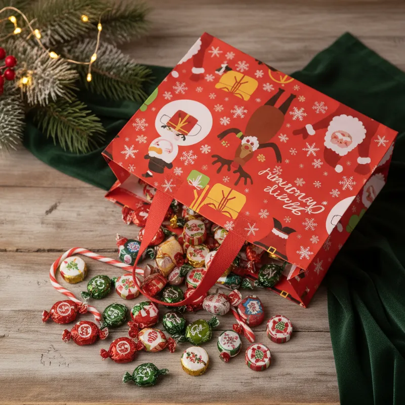 De feestelijke tas gebruikt voor al onze familiegiften dit jaar. De handvatten zijn echt comfortabel en het vrolijke ontwerp maakte iedereen zo blij op kerstochtend.