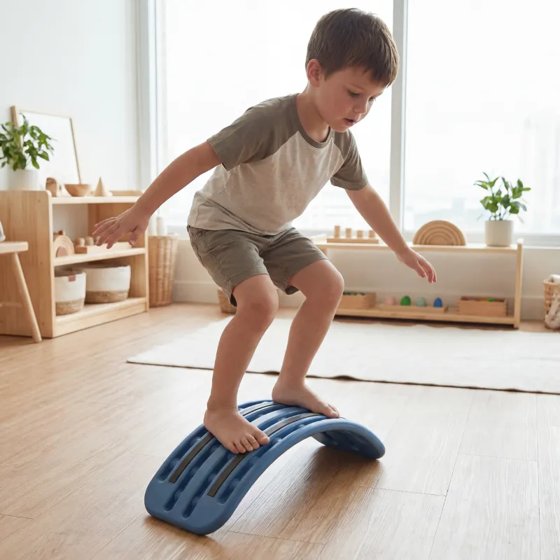 Ik ben kleuterjuf en heb dit gebogen bord mee naar de klas genomen. Kinderen lopen er om de beurt overheen alsof het een brug is en het helpt echt bij hun coördinatie en zelfvertrouwen.