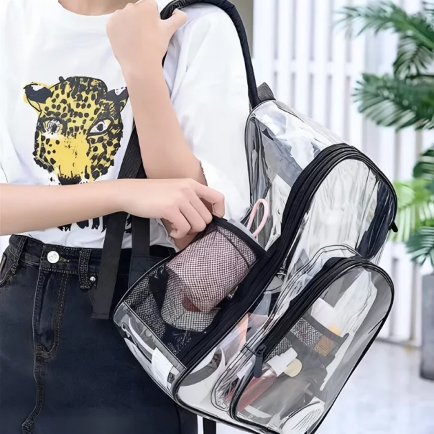 De doorzichtige tas biedt veel meer ruimte dan je denkt. Boeken, waterfles en zelfs haar extra trui passen erin. Alles past en niets raakt geplet.