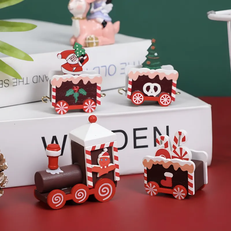 Het houten treintje bracht iedereen in de feeststemming. We namen om de beurt een karretje om neer te zetten, en nu voelt het als kerst als we het zien.