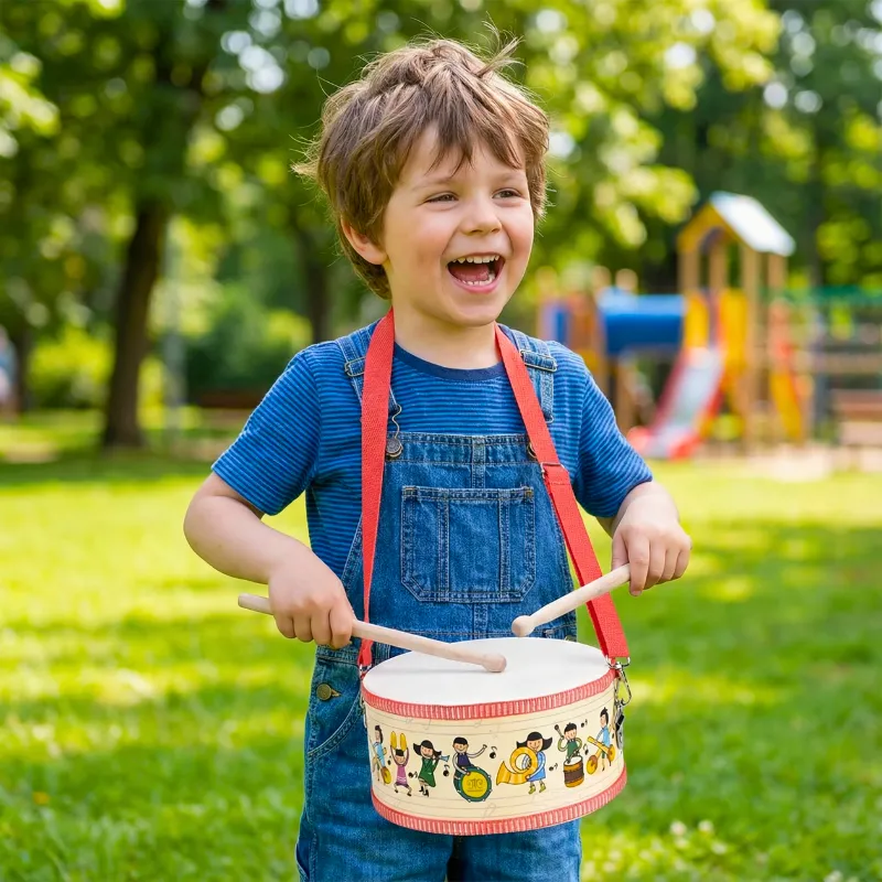 We nemen de trommel mee naar oma. Hij is licht en veilig, en alle neefjes en nichtjes doen mee met muziek. Maakt familiebezoeken extra leuk.